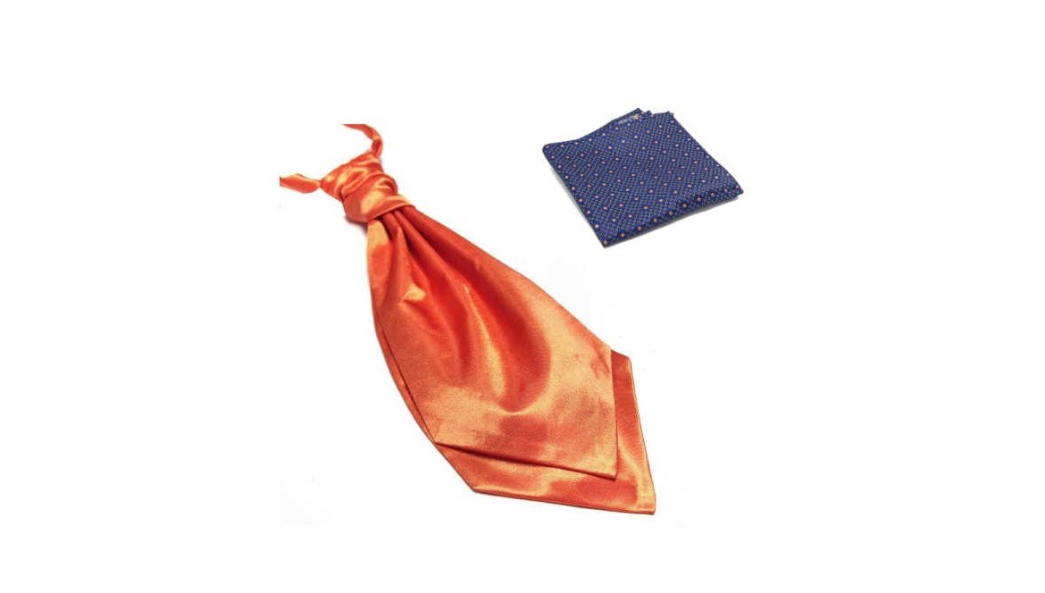 Lavallière orange en satin et pochette bleue à pois orange – Élégance pour mariage